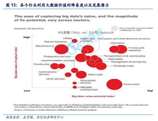 根麥據(jù)肯錫大數(shù)據(jù)研究報(bào)告指出, 各個(gè)行業(yè)利用大數(shù)據(jù)價(jià)值的難易度以及發(fā)展?jié)摿?對(duì)比下,政府利用大數(shù)據(jù)難度最低而潛力最大。