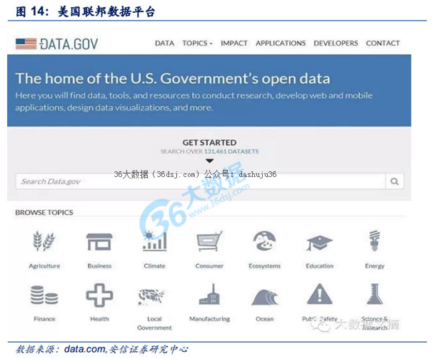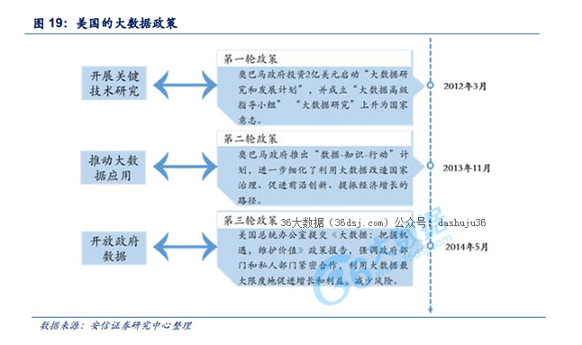 大數(shù)據(jù)時(shí)代,對(duì)大數(shù)據(jù)的開(kāi)發(fā)、利用與保護(hù)的爭(zhēng)奪日趨激烈,制信權(quán)成為繼制陸權(quán)、制海權(quán)、制空權(quán)之后的新制權(quán),大數(shù)據(jù)處理能力成為強(qiáng)國(guó)弱國(guó)區(qū)分的又一重要指標(biāo)。國(guó)際上以美國(guó)為代表的發(fā)達(dá)國(guó)家紛紛布局大數(shù)據(jù)產(chǎn)業(yè),相繼推出大數(shù)據(jù)相關(guān)政策,大力支持大數(shù)據(jù)產(chǎn) 業(yè)在本國(guó)的發(fā)展。以美國(guó)為例,美國(guó)從開(kāi)展關(guān)鍵技術(shù)研究、推動(dòng)大數(shù)據(jù)應(yīng)用和開(kāi)放政府?dāng)?shù)據(jù)三方面布局大數(shù)據(jù)產(chǎn)業(yè),尤其在開(kāi)放政府?dāng)?shù)據(jù)方面非常積極,通過(guò) Data.gov開(kāi)放 37 萬(wàn)個(gè)數(shù)據(jù)集,并開(kāi)放網(wǎng)站的 API 和源代碼,提供上千個(gè)數(shù)據(jù)應(yīng)用。我們認(rèn)為,大數(shù)據(jù)未來(lái)將 引發(fā)新一輪大國(guó)競(jìng)爭(zhēng),大數(shù)據(jù)對(duì)整個(gè)世界的影響力會(huì)呈現(xiàn)爆發(fā)性增長(zhǎng)趨勢(shì),因此包括我國(guó)在內(nèi)的國(guó)家會(huì)在政策支持力度上不斷提升,大數(shù)據(jù)戰(zhàn)略將上升至國(guó)家戰(zhàn)略已毋庸臵疑。