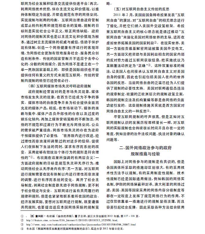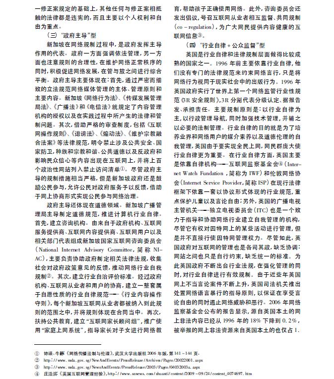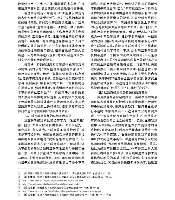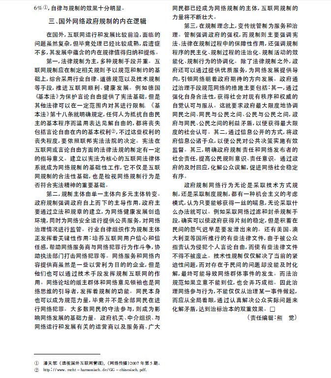 摘要:國(guó)外互聯(lián)網(wǎng)發(fā)展過(guò)程中有很多成熟的管理和規(guī)制經(jīng)驗(yàn),他們通過(guò)健全法律制度、完善道德規(guī)范、豐富規(guī)制手段、加強(qiáng)技術(shù)開(kāi)發(fā)等比較成熟的做法使互聯(lián)網(wǎng)運(yùn)轉(zhuǎn)走上了健康發(fā)展之道;國(guó)外對(duì)網(wǎng)絡(luò)參與行為進(jìn)行規(guī)制的認(rèn)識(shí)有過(guò)艱苦的思想考量過(guò)程,也值得我們?cè)谶x擇規(guī)制措施上做出理性判斷。他們以規(guī)制為主、多手段并舉,推進(jìn)了規(guī)制主體由一元向多元轉(zhuǎn)變。在規(guī)制理念上,變傳統(tǒng)的管理統(tǒng)制為服務(wù)和治理,政府強(qiáng)化回應(yīng)機(jī)制建設(shè),促進(jìn)了網(wǎng)絡(luò)社會(huì)的穩(wěn)定有序。國(guó)外規(guī)制網(wǎng)絡(luò)參與的經(jīng)驗(yàn)和成功做法,將對(duì)我國(guó)的網(wǎng)絡(luò)問(wèn)政規(guī)制工作提供經(jīng)驗(yàn)借鑒。