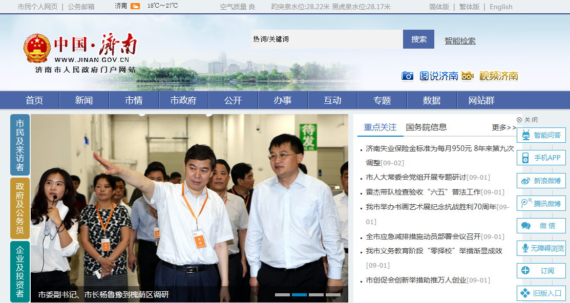 登陸濟(jì)南市政府門戶網(wǎng)站(http://www.jinan.gov.cn),在淡藍(lán)色的基調(diào)下,首先映入眼簾的是網(wǎng)站導(dǎo)航,包括“新聞”、“市情”、“市政府”、“公開”、“辦事”、“互動(dòng)”、“專題”、“數(shù)據(jù)”等欄目以及網(wǎng)站群。相較于老版,網(wǎng)頁(yè)的字體變大了,字體的行間距也更大了,首頁(yè)還加大了圖片的比重,網(wǎng)友點(diǎn)擊登錄網(wǎng)站后可以感受到圖片帶來的視覺沖擊力。