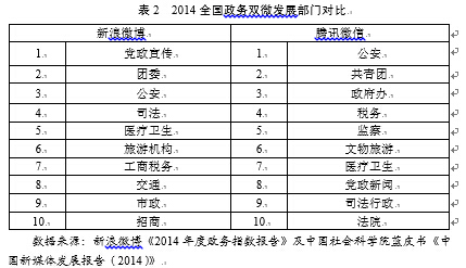 2014年政務(wù)“雙微”在部門系統(tǒng)分布對比相對來說呈現(xiàn)出縱向?qū)Ρ炔痪?,橫向?qū)Ρ认鄬^均衡的態(tài)勢,如表2所示。在《2014政務(wù)新媒體傳播力報(bào)告》里,排名前三的黨政宣傳、團(tuán)委、公安分別以29099家、19052家和17025家各自占據(jù)所有部門微博總數(shù)94164家的30.9%、20.2%和18.1%,三個系統(tǒng)的政務(wù)微博占據(jù)了所有政府系統(tǒng)的一半以上比例,可見,政務(wù)微博發(fā)展縱向?qū)Ρ葮O其不均衡。而政務(wù)微信發(fā)展排行前三的依次為公安1635個、旅游 1004個、司法813個,分別占據(jù)全國政務(wù)微信總數(shù)16446家的9.9%、6.1%、4.9%,雖然在總比例上不及地域分布那么不均衡,但是因?yàn)檎?wù)微信的部門系統(tǒng)分布的比較細(xì),因此,縱向?qū)Ρ茸陨硪廊粚儆诓痪獍l(fā)展?fàn)顟B(tài)。值得關(guān)注的是,公安、司法、稅務(wù)、醫(yī)療衛(wèi)生以及文化旅游五個常常處于社會利益沖突最前端的部門成為政務(wù)“雙微”最熱部門,也是亟待開展“指尖上的對話”部門。
