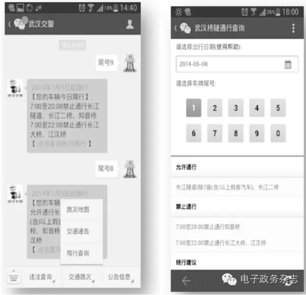 2013年9月5日,“武漢交警”完成了微信平臺(tái)1.1版本升級(jí),推出了位于“交通路況”菜單內(nèi)的過(guò)江限行查詢功能,當(dāng)日用戶增長(zhǎng)量突破1萬(wàn)?!跋扌胁樵儭惫δ苁悄壳啊拔錆h交警”微信平臺(tái)內(nèi)使用率最高的服務(wù)項(xiàng)目,過(guò)江限行查詢的基本操作為:輸入“車牌尾號(hào)”或點(diǎn)擊菜單“限行查詢”即可獲知當(dāng)日車輛是否可過(guò)江。該操作很簡(jiǎn)明,有效解決了廣大駕駛員在面對(duì)交管部門復(fù)雜的限行規(guī)定時(shí),難以快速準(zhǔn)確了解自己所駕駛車輛是否能夠通行特定限行橋隧的問(wèn)題,進(jìn)而幫助駕駛員提前規(guī)劃好行車路線,避免無(wú)意違章行為的發(fā)生(參見(jiàn)圖1)。