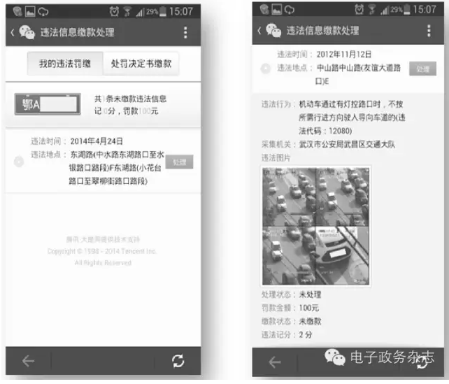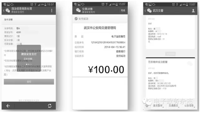 2014年5月26日,由騰訊大楚網(wǎng)與武漢市公安局交通管理局聯(lián)合開(kāi)發(fā)推出“武漢交警”3。0版本微信支付交通違法罰款功能?!拔錆h交警”成為全國(guó)首例支持微信支付繳納罰單的政務(wù)微信公眾賬號(hào)。用戶關(guān)注“武漢交警”微信公眾賬號(hào)并綁定個(gè)人信息后,當(dāng)車輛出現(xiàn)交通違法現(xiàn)象,就可以及時(shí)收到交管部門主動(dòng)推送的信息提醒,用戶可以通過(guò)微信平臺(tái)查詢自己的詳細(xì)違法記錄,包括違法時(shí)間、違法地點(diǎn)、違法行為、采集機(jī)關(guān)、4張不同角度拍攝的違法圖片、罰款金額以及違法記分等信息都會(huì)清晰顯示。在核實(shí)信息后,用戶即可微信支付“處理”罰單,支付成功后,“武漢交警”還會(huì)推送“罰款繳納成功提醒”,包含車主姓名、車牌號(hào)、違法地點(diǎn)、駕駛證扣分情況等,讓車主對(duì)自己的罰單繳納記錄一目了然(參見(jiàn)圖3、圖4)。