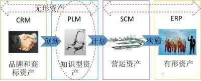當(dāng)前制造業(yè)企業(yè)中普遍存在著四種主要的資產(chǎn)管理的需求,分別是品牌、商標(biāo)資產(chǎn)、知識型資產(chǎn)、營運資產(chǎn)和有形資產(chǎn)。這四種資產(chǎn)在當(dāng)前制造業(yè)從工業(yè)3.0向工業(yè)4.0階段的過渡時期對應(yīng)的信息化管理技術(shù)分別是CRM、PLM、SCM、ERP。