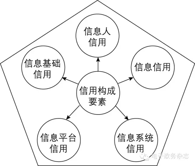 信息平臺依靠信息基礎(chǔ)建設(shè),是信息系統(tǒng)和信息的載體,也是信息人操作的工具和對象。狹義的信息平臺僅包括網(wǎng)絡(luò)平臺、存儲平臺和應(yīng)用平臺,而廣義的信息平臺還包括硬件設(shè)備、程序系統(tǒng)和人。所以,信息平臺信用可涵蓋信息平臺狹義范疇中各要素的信用,也可涵蓋信息平臺廣義范疇中各要素的信用。此外,基于以下考慮,信息平臺信用的外延還有擴展的必要:其一,電子政府構(gòu)建旨在建設(shè)開放統(tǒng)一的信息平臺,這就必然要求各級政府及其部門進行跨地區(qū)、跨層級、跨部門合作,共建共享,互聯(lián)互通,業(yè)務(wù)協(xié)同。如此,信息平臺信用就必然涉及參與其中的各級政府及其部門的信用,其中任何一方的信用缺失和行為失范都會影響到整體信用,需要建立工作標(biāo)準(zhǔn)和行為規(guī)則來約束。因此,平臺的工作標(biāo)準(zhǔn)、行為規(guī)則以及整合在平臺上的各級政府及其部門的信用也將成為信息平臺信用的構(gòu)成要素。其二,統(tǒng)一的信息平臺需要以資源共享和業(yè)務(wù)協(xié)同作支撐,由此可見,各級政府部門所提供資源的信用,以及業(yè)務(wù)協(xié)同中各部門的信用,連同辦事流程的信用也應(yīng)成為信息平臺信用的構(gòu)成要素。其三,信息平臺依靠IT企業(yè)建設(shè)和運維,也需要政府內(nèi)部事業(yè)編制的技術(shù)部門支持,因而企業(yè)和技術(shù)部門的信用將直接影響信息平臺的質(zhì)量和績效。