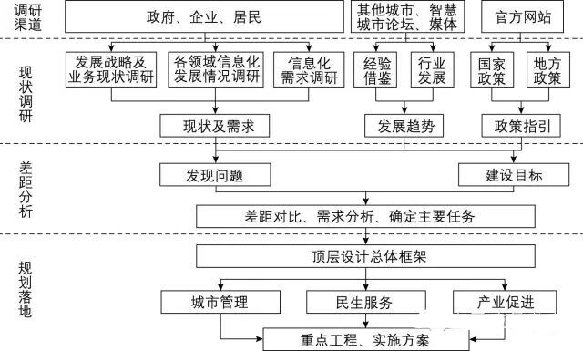 智慧城市頂層規(guī)劃分為三個(gè)階段:現(xiàn)狀調(diào)研、差距分析、規(guī)劃落地(參見圖3)。