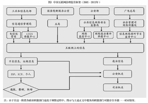 第三,對我國互聯(lián)網(wǎng)信息內(nèi)容管理的主管機構、制度建設進程特點進行了研究。張文祥認為,從1994年接入互聯(lián)網(wǎng)以來,新聞信息就是我國互聯(lián)網(wǎng)信息管理的重要對象,經(jīng)過20年的探索,目前已形成一套復雜的互聯(lián)網(wǎng)新聞信息管理制度,帶有較為濃重的“規(guī)制摸索”特征。曠野認為,自上個世紀90年代起,我國的信息化制度建設進程明顯加快,一個與信息化發(fā)展相適應的法制環(huán)境正在形成。主要表現(xiàn)在:(1)數(shù)據(jù)電文的法律制度已經(jīng)形成;(2)互聯(lián)網(wǎng)信息分類管理的法律框架已具雛形;(3)電信法、廣播網(wǎng)分業(yè)監(jiān)管的格局基本維持;(4)信息技術應用的相關法律制度仍在探索完善中;(5)信息安全的法律制度已有一定基礎。高宏存、于正認為,網(wǎng)絡新媒體的監(jiān)管反映出政府治理水平提升的過程,并總結了四類參與網(wǎng)絡新媒體管制的行政機構:(1)接入監(jiān)管部門,如工信部門與工商部門;(2)安全管理部門,如公安部門和國家安全部門;(3)中央和地方的新聞辦公室和對外宣傳辦公室是我國網(wǎng)絡新媒體最直接的內(nèi)容管制部門;(4)其他有關部門,主要指文化部門、新聞出版部門、廣電部門。他們將新媒體的監(jiān)管劃分為四個階段:奠基起步階段、激勵發(fā)展階段、問題治理階段、綜合治理階段。分別涉及的核心議題包括基礎設施保護、信息服務管理、傳播權利保護、不良信息整治。