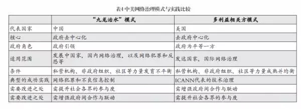 比較中美互聯(lián)網(wǎng)治理模式與實踐的主要不同點(表4),我們可以發(fā)現(xiàn):