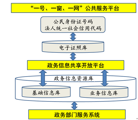 “一號、一窗、一網(wǎng)”的信息共享開放業(yè)務(wù)架構(gòu)為:通過統(tǒng)一的公民身份證號、法人統(tǒng)一社會信用代碼和綁定身份證號及法人代碼的實名電子證照,對接教育服務(wù)、醫(yī)療衛(wèi)生、社會保險、社會福利、社會救助、住房公積金、勞動就業(yè)、婚姻登記、殯葬服務(wù)、住房保障、公共安全等民生服務(wù)領(lǐng)域的政務(wù)信息共享和開放,實現(xiàn)“一號申請、一窗受理、一網(wǎng)通辦”的政務(wù)服務(wù)。