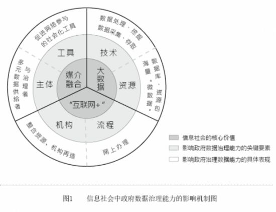 大數(shù)據(jù)是指大小超出了典型數(shù)據(jù)庫(kù)軟件工具收集、存儲(chǔ)、管理和分析能力的數(shù)據(jù)集,具有容量大、多樣性、速度快和構(gòu)成復(fù)雜等特性;政府治理能力是政府管理社會(huì)事務(wù)、服務(wù)大眾需要、平衡社會(huì)矛盾、促進(jìn)社會(huì)穩(wěn)定發(fā)展的所有潛在的或現(xiàn)實(shí)的能量或力量的有機(jī)整體,具體包括價(jià)值塑造、資源聚集、網(wǎng)絡(luò)構(gòu)建、流程創(chuàng)新和問(wèn)題回應(yīng)等能力。因此,政府?dāng)?shù)據(jù)治理能力,特指政府收集、分析以及應(yīng)用數(shù)據(jù)達(dá)到上述目標(biāo)或行為的力量。它是在信息社會(huì)和大數(shù)據(jù)時(shí)代中,政府調(diào)節(jié)經(jīng)濟(jì)社會(huì)職能、服務(wù)于經(jīng)濟(jì)社會(huì)發(fā)展能力的重要體現(xiàn),關(guān)系到國(guó)家和社會(huì)的現(xiàn)代化建設(shè),與公眾的幸福指數(shù)緊密關(guān)聯(lián)。