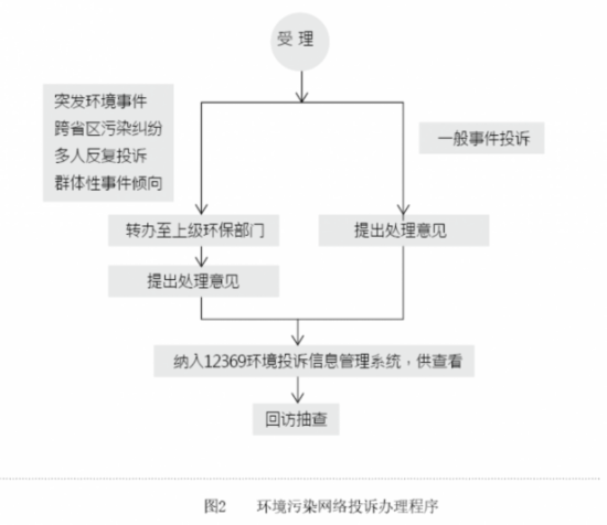 在組織機(jī)構(gòu)上,我國(guó)沿襲了韋伯官僚制組織機(jī)構(gòu),具有金字塔式的等級(jí)制、專業(yè)分工、明確程序與制度等特征,因此政府管理系統(tǒng)層級(jí)設(shè)置與部門增多,機(jī)構(gòu)臃腫,人浮于事。 借助互聯(lián)網(wǎng)平臺(tái)能夠整合資源,調(diào)整政府機(jī)構(gòu)或職能,集中處理投訴案件。2010年7月,鄭州市人民政府成立網(wǎng)絡(luò)信息發(fā)布中心(ZZIC),以“事事有回應(yīng),件件有回音”為口號(hào),承擔(dān)政務(wù)信息發(fā)布、轉(zhuǎn)辦網(wǎng)友意見(jiàn)和投訴等職責(zé)。環(huán)境保護(hù)部設(shè)立“12369”環(huán)保舉報(bào)熱線,明確辦理投訴件的程序(見(jiàn)圖2),建立投訴信息管理系統(tǒng),每個(gè)投訴件設(shè)立一個(gè)編號(hào),供舉報(bào)者查詢辦理進(jìn)程。并進(jìn)行監(jiān)督和回訪抽查,如果投訴人對(duì)處理結(jié)果不滿意,受理者須限期重新回復(fù)和調(diào)節(jié)糾紛。