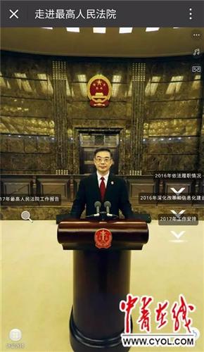 一經(jīng)掃描,頁面即彈出最高人民法院主建筑畫面,滑動屏幕,還可360度旋轉(zhuǎn)看到院內(nèi)的大門、綠化帶等場景。 VR中的主建筑正門處,有一個(gè)“2017年最高人民法工作報(bào)告”的圓點(diǎn)。點(diǎn)擊后,映入眼簾的是最高人民法院院長周強(qiáng)站在發(fā)言臺前的圖像。 提到最高法加強(qiáng)庭審公開的時(shí)候,他說了一組數(shù)據(jù):自去年7月1日起,所有公開開庭案件都上網(wǎng)直播,各級法院直播庭審62.5萬次,觀看量達(dá)到20.7億人次。