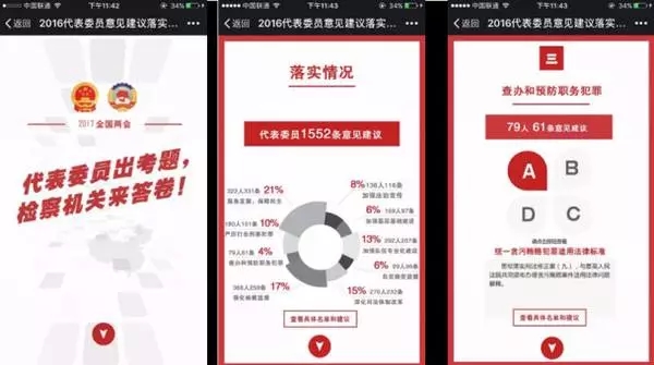 《最高人民檢察院工作報(bào)告》首頁上同樣出現(xiàn)了二維碼,掃描后的頁面中有輕快的背景音樂配合活潑的動畫,通過一組組數(shù)據(jù)和案例,從維穩(wěn)、經(jīng)濟(jì)、反腐、司法公正等7個(gè)方面,體現(xiàn)了2016年檢察機(jī)關(guān)的工作成果,還包括2017年檢察機(jī)關(guān)工作計(jì)劃 除此之外,還有一個(gè)互動性的H5《代表委員出題,檢察機(jī)關(guān)來答卷》。