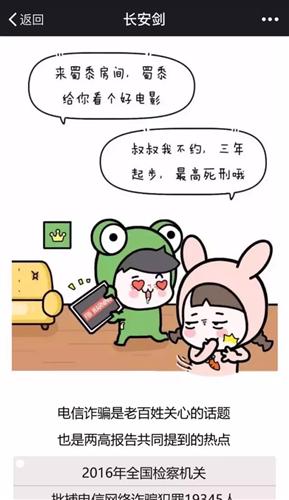 除了互動小游戲,“長安劍”還與“蛙哥漫畫”合作,推出了《3分鐘讓你看懂“兩高報(bào)告”》(看到這個(gè)題目,是不是想到了谷阿莫的《x分鐘看完xxx》系列?),用軟萌的畫風(fēng)、活潑的對話把“兩高報(bào)告”中的重點(diǎn)內(nèi)容傳達(dá)了出來。