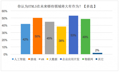 與此同時(shí),53%的人認(rèn)為HTML5將最有可能在企業(yè)級(jí)應(yīng)用領(lǐng)域得到廣泛應(yīng)用,這一比例超過(guò)物聯(lián)網(wǎng)、游戲,VR等。整體而言,開發(fā)者都對(duì)HTML5在未來(lái)的應(yīng)用前景持非常樂觀的態(tài)度。