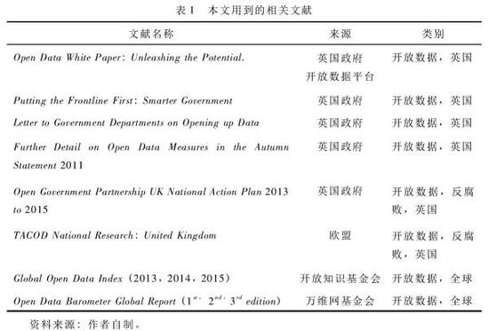 除了案例分析法之外,本文還將運用二手資料分析以及人工觀察的方法。我們將搜索到的英國政府和相關(guān)國際組織(如開放知識基金會、萬維網(wǎng)基金會) 有關(guān)數(shù)據(jù)開放和反腐敗的文件以及報告分為四類: 開放數(shù)據(jù)類、反腐敗類、英國類、全球類(參見表1)。我們將重點關(guān)注和分析英國政府開放數(shù)據(jù)行動的政策基礎(chǔ)、組織機制以及開放數(shù)據(jù)在腐敗防治方面的潛在作用。此外,通過人工觀察英國數(shù)據(jù)開放平臺data. gov. uk,本文將介紹英國數(shù)據(jù)開放的具體內(nèi)容、格式以及已經(jīng)開放的有利于揭發(fā)腐敗行為的具體數(shù)據(jù)集。所有數(shù)據(jù)的采集時間截至2016年7月26日。