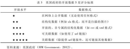 開放的數(shù)據(jù)格式包括csv、html、xls、wms、pdf、xml、rdf、zip、ods以及json。Data. gov. uk采用了萬維網(wǎng)之父、英國計算機科學(xué)家蒂姆·伯納斯-李(Sir Tim Berners-Lee,1955—)關(guān)于數(shù)據(jù)開放度的5 星評分標(biāo)準并對其有所擴展。如表3所示,1顆星代表著在網(wǎng)絡(luò)上公開數(shù)據(jù)(無論使用任何格式) ; 2 顆星代表使用了結(jié)構(gòu)化數(shù)據(jù)(例如xls格式) ; 3顆星意味著使用了開放格式的結(jié)構(gòu)化數(shù)據(jù)(如csv或xml格式) ; 4顆星代表著使用了可關(guān)聯(lián)數(shù)據(jù)(如使用了url鏈接),5顆星代表使用了關(guān)聯(lián)數(shù)據(jù)(除提供url鏈接外,還可鏈接其他數(shù)據(jù)) 。
