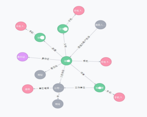 圖數(shù)據(jù)庫能通過“實體”和“關(guān)系”這種簡單直觀的描述方法來表述現(xiàn)實世界中錯綜復雜的關(guān)聯(lián)關(guān)系。它可以提供逐層挖掘的方式,引導逐步深入分析各種關(guān)系;還可以快速呈現(xiàn)實體之間最新的關(guān)系變化,積累更新的知識和經(jīng)驗;也可以清晰地呈現(xiàn)復雜關(guān)系間的聯(lián)絡線索,為判斷事件來龍去脈提供有效引導。此處,以恒昌的客戶為例,參考圖1中的客戶徐某(因數(shù)據(jù)安全的原因,部分信息作了涂抹,并對原有圖結(jié)構(gòu)進行了簡化),如果僅考慮該客戶自己填寫的信息,雖然能看到一度關(guān)聯(lián)信息,但完全看不出該結(jié)構(gòu)會有什么問題,也無法進行深入調(diào)查。