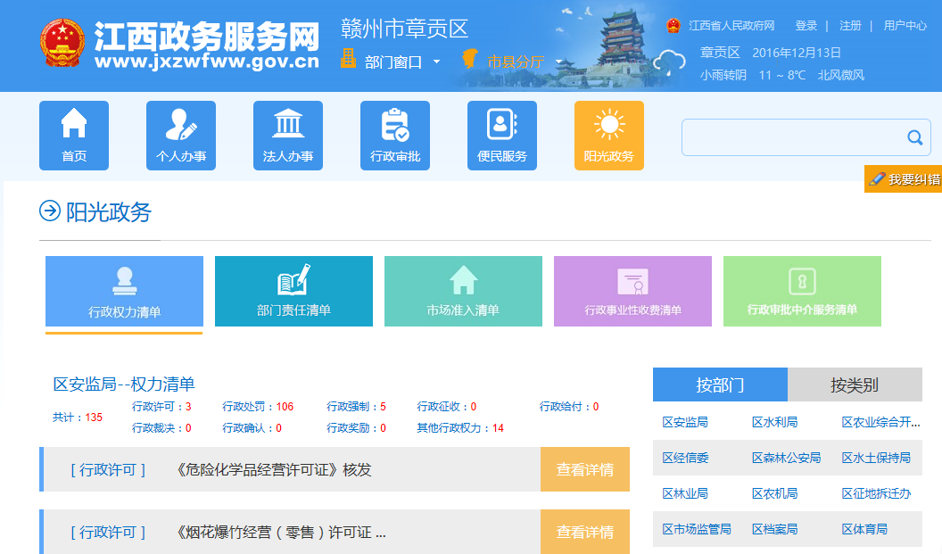 章貢區(qū)政府網(wǎng)站融合了省市縣一體化的"互聯(lián)網(wǎng)+政務(wù)服務(wù)"平臺(tái),建設(shè)章貢區(qū)政務(wù)服務(wù)網(wǎng),平臺(tái)集行政審批、便民服務(wù)、陽(yáng)光政務(wù)、互動(dòng)交流等功能于一體,實(shí)現(xiàn)了政務(wù)服務(wù)資源的有效整合與共享。平臺(tái)按照國(guó)家政策要求,推進(jìn)了行政權(quán)力清單、部門責(zé)任清單、市場(chǎng)準(zhǔn)入清單、行政事業(yè)性收費(fèi)清單、行政審批中介服務(wù)清單5張清單公開;按照"個(gè)人辦事、法人辦事、部門服務(wù)"三個(gè)維度,整合了辦事指南、在線申請(qǐng)、在線咨詢等辦事服務(wù)資源,為公眾提供"一站式"、"一網(wǎng)式"的統(tǒng)一政務(wù)服務(wù),促進(jìn)辦事效率的不斷提高,實(shí)現(xiàn)讓"群眾跑腿"變"信息跑腿"。