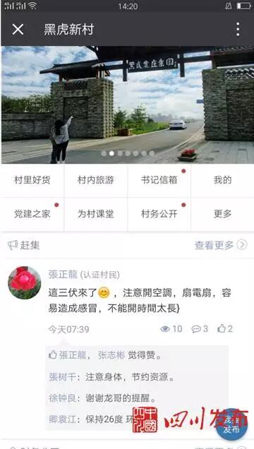 “這還不是最新鮮的。”張樹千掏出手機,向記者演示黑虎村微信公眾號?!拔覀冞@個公眾號已有1200余人關(guān)注?!睆垬淝н呇菔具吔榻B,這個公眾號,應用政府網(wǎng)站模塊,整合網(wǎng)絡資源,開設(shè)了“美麗黑虎”和“為村平臺”兩大功能板塊?!懊利惡诨ⅰ笔钦㈤T戶集群化建設(shè)的功能載體,與邛崍市人民政府門戶網(wǎng)站手機版一鍵連通,群眾可以通過手機享受到政府門戶網(wǎng)站上所有服務。