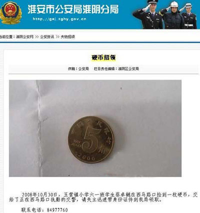 這則5毛錢招領(lǐng)告示系江蘇省淮安市淮陰公安分局所發(fā)。啟示稱,“王營鎮(zhèn)小學六一班學生蔡卓樾在西馬路口撿到一枚硬幣,交給了正在西馬路口執(zhí)勤的交警,請失主迅速帶身份證件到我局領(lǐng)取”。啟示上還附有照片,一枚銹跡斑斑的5毛錢硬幣,靜靜躺在照片里。據(jù)悉,這是他們根據(jù)上級的要求,作為政府信息公開的具體實施步驟,通過互聯(lián)網(wǎng)發(fā)布失物招領(lǐng)信息。記者搜索到5毛錢硬幣頁面已被刪除。不過,能通過“快照”看到。