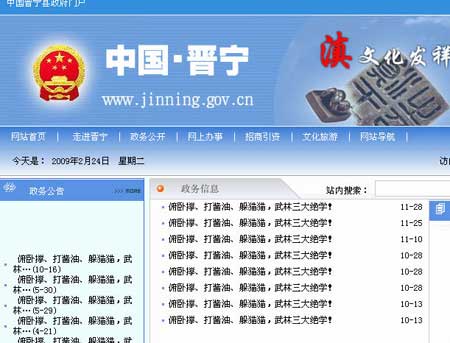 24日晚10時,記者在晉寧縣政府門戶網(wǎng)站(www.jinning.gov.cn)上看到,網(wǎng)站首頁充斥著幾十行“俯臥撐、打醬油、躲貓貓,武林三大絕學(xué)!”的字樣,公示公告、政務(wù)信息、領(lǐng)導(dǎo)講話、政務(wù)文件、政策法規(guī)、統(tǒng)計數(shù)據(jù)、招商引資、文化旅游等欄目原有的內(nèi)容都被替換成“俯臥撐、打醬油、躲貓貓,武林三大絕學(xué)!”。除了一些圖片無法刪改外,所有的文章標(biāo)題、圖片的注釋也都被改為以上字樣。