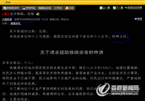 該貼子被貼在網(wǎng)友“大漠孤煙”的QQ空間上,文中作者呼吁為家鄉(xiāng)修建通村公路募集資金,并表示:“家鄉(xiāng)修通村公路,化緣。有錢的單位和個(gè)人可捐款,捐款后在空間留下單位和個(gè)人名字,樹碑立傳”。