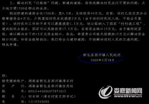 帖子內(nèi)容是一則《關(guān)于請(qǐng)求援助修路資金的申請(qǐng)》,這個(gè)申請(qǐng)是由婁底市“新化縣西河村人民政府”2009年2月28日發(fā)布的。該貼提到,西河鎮(zhèn)滑石村地處國家級(jí)貧困縣新化縣中部,轄區(qū)人口大約1500人,地理位置偏僻,村民多以種植水稻、蔬菜等農(nóng)作物和養(yǎng)殖雞、豬等禽畜產(chǎn)品為生,總體經(jīng)濟(jì)實(shí)力薄弱。但是客觀因素卻制約了該村經(jīng)濟(jì)的發(fā)展,修建村級(jí)公路將“促進(jìn)該村種養(yǎng)業(yè)的發(fā)展、加強(qiáng)招商的吸引力、解決村民‘行路難’問題”。