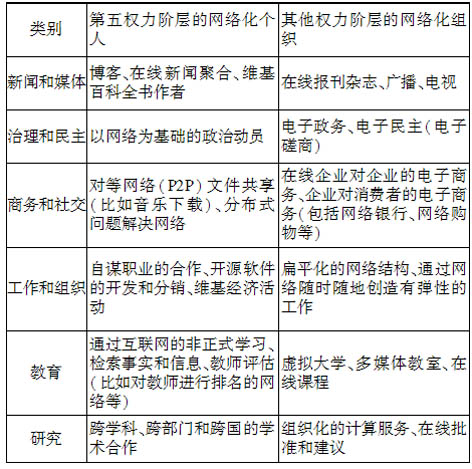 表1 網(wǎng)絡(luò)化組織和個(gè)人的不同類別(資料來(lái)源:William H. Dutton. The Fifth Estate:Through the Network (of Networks). http://people.oii.ox.ac.uk/dutton/wp-content/uploads/2007/10/5th-estate-lecture-text.pdf.)
