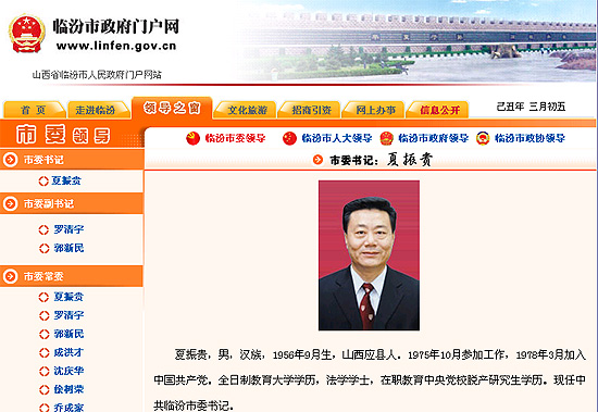 針對近日網(wǎng)上流傳的山西臨汾“自潰壩事故以來半年無人任市委書記”、“兩會”至今尚未召開”的信息,編輯上午瀏覽了“臨汾市政府門戶網(wǎng)”發(fā)現(xiàn):臨汾市政府網(wǎng)站仍顯示夏振貴現(xiàn)任臨汾市委書記,羅清宇則現(xiàn)任中共臨汾市委副書記、代市長。