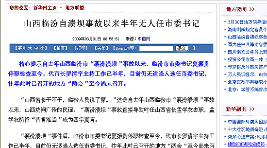 據(jù)網(wǎng)上信息顯示:“襄汾潰壩”事件后,臨汾市市委書記夏振貴停職檢查至今,代市長羅清宇主持工作已半年,目前仍無適當人選任市委書記,往年此時已召開的地方“兩會”至今尚未召開。