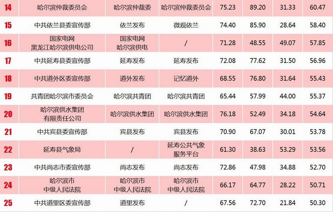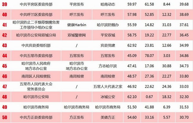 《報告》推出“哈爾濱政務新媒體綜合影響力榜單”“哈爾濱市直單位政務新媒體綜合影響力榜單”“哈爾濱區(qū)、縣(市)政務新媒體綜合影響力榜單”“哈爾濱基層單位政務新媒體綜合影響力榜單”“哈爾濱市新聞單位新媒體影響力榜單”,統(tǒng)計時間為2014至2016年。在全市綜合影響力十強榜單中,市直機構(gòu)呈現(xiàn)壓倒性優(yōu)勢,占據(jù)7個席位,區(qū)縣(市)機構(gòu)占據(jù)3席。