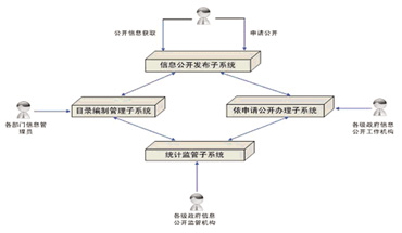 平臺采用了集中數(shù)據(jù)、個性表現(xiàn)和分散受理的建設(shè)總原則,市政府門戶網(wǎng)站作為總的發(fā)布平臺,各單位網(wǎng)站根據(jù)提供的數(shù)據(jù)接口或嵌入式網(wǎng)頁作為各單位的發(fā)布平臺。依申請公開和意見箱在市政府網(wǎng)站集中受理,在各單位網(wǎng)站分散受理,后臺邏輯保持統(tǒng)一。整個政府信息公開平臺由目錄編制管理、信息公開發(fā)布、依申請公開辦理、統(tǒng)計監(jiān)管等4個大的子系統(tǒng)構(gòu)成。如下圖所示: