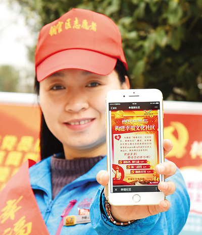 安徽省銅陵市銅官區(qū)幸福社區(qū)工作人員在指導(dǎo)社區(qū)居民和黨員掃描和關(guān)注與黨建相關(guān)的微信公眾號。劉敏攝