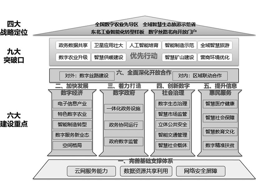 以東北工業(yè)智能化轉(zhuǎn)型樣板、全國數(shù)字農(nóng)業(yè)先導(dǎo)區(qū)、全域智慧生態(tài)旅游示范省和數(shù)字絲路北向開放門戶四大定位為目標(biāo),以完善基礎(chǔ)支撐體系、加快發(fā)展數(shù)字經(jīng)濟(jì)、著力打造數(shù)字政府、創(chuàng)新數(shù)字社會治理、提升信息惠民服務(wù)和全面深化開放合作為六大重點,以政務(wù)數(shù)據(jù)共享、衛(wèi)星應(yīng)用壯大、人工智能培育、智能制造示范、全域智慧旅游、數(shù)字農(nóng)業(yè)升級、智慧供暖建設(shè)、智慧礦山建設(shè)、營商環(huán)境優(yōu)化為九大突破口,形成“469”的“數(shù)字龍江”總體框架。