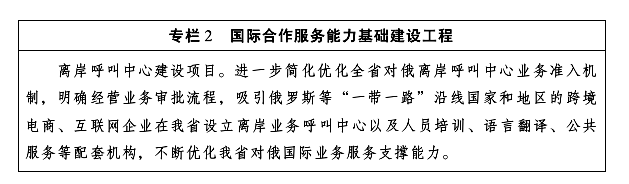 提升國際通信服務(wù)能力。推進(jìn)對俄對歐跨境通信傳輸網(wǎng)絡(luò)建設(shè)優(yōu)化,適時擴(kuò)容網(wǎng)絡(luò)承載能力,增強(qiáng)我省對俄開放通信服務(wù)支撐能力。積極爭取國家支持,開通哈爾濱區(qū)域國際互聯(lián)網(wǎng)轉(zhuǎn)接點,提升我省國際互聯(lián)網(wǎng)節(jié)點地位。爭取在我省沿邊開發(fā)開放試驗區(qū)、綜合保稅區(qū)、邊民互市貿(mào)易區(qū)等園區(qū),開設(shè)對俄國際互聯(lián)網(wǎng)數(shù)據(jù)專用通道,提高園區(qū)企業(yè)國際通信服務(wù)質(zhì)量和安全保障能力。發(fā)揮哈爾濱、牡丹江、大慶等服務(wù)外包政策和產(chǎn)業(yè)優(yōu)勢,支持和鼓勵企業(yè)建設(shè)呼叫中心,重點發(fā)展面向通信、金融、先進(jìn)制造、互聯(lián)網(wǎng)等產(chǎn)業(yè)的語音、在線等客戶服務(wù)業(yè)務(wù)。進(jìn)一步簡化優(yōu)化離岸呼叫業(yè)務(wù)審批流程,吸引企業(yè)投資設(shè)立離岸呼叫中心,拓展離岸呼叫外包服務(wù),支撐“中蒙俄經(jīng)濟(jì)走廊”建設(shè),助力“一帶一路”國際合作。