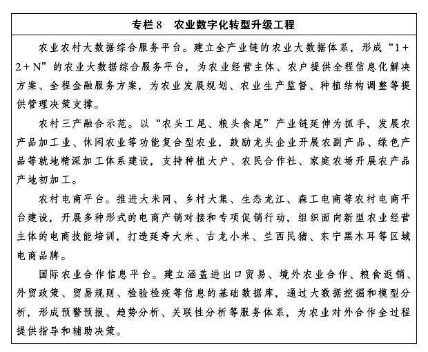 全國數(shù)字農(nóng)業(yè)先導(dǎo)區(qū)。發(fā)揮國家糧食“壓艙石”和現(xiàn)代農(nóng)業(yè)基地優(yōu)勢,打造機(jī)械化與信息化深度融合“龍江樣板”,圍繞“糧頭食尾”和“農(nóng)頭工尾”,加快糧食主產(chǎn)區(qū)、境外農(nóng)業(yè)合作示范區(qū)數(shù)字化改造,開展農(nóng)村一二三產(chǎn)業(yè)融合示范建設(shè),打造具有影響力的全國數(shù)字農(nóng)業(yè)先導(dǎo)示范區(qū)。