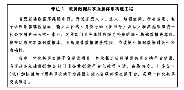 強(qiáng)化一體化數(shù)據(jù)資源整合與共享。加快推進(jìn)省級政務(wù)基礎(chǔ)數(shù)據(jù)資源體系建設(shè),統(tǒng)籌搭建人口、法人、地理空間、社會信用、電子證照等基礎(chǔ)數(shù)據(jù)庫,協(xié)調(diào)推進(jìn)自然資源、交通運輸、醫(yī)療衛(wèi)生等重點領(lǐng)域主題數(shù)據(jù)庫建設(shè),強(qiáng)化政務(wù)大數(shù)據(jù)應(yīng)用數(shù)據(jù)資源儲備。推進(jìn)省兩級一體化政務(wù)共享交換平臺建設(shè)和互聯(lián)互通,打通與國家政務(wù)共享交換平臺和各部門業(yè)務(wù)系統(tǒng)接口,打造跨層級、部門數(shù)據(jù)互聯(lián)互通“大通道”,推動政務(wù)數(shù)據(jù)資源按需申請、順暢流通、高效共享。建立健全軍地信息跨網(wǎng)聯(lián)接和數(shù)據(jù)交換機(jī)制,推動測繪地理、氣象、地震、水文、交通運輸、戰(zhàn)略物資儲備等信息安全共享。