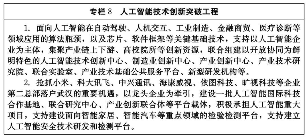 ?。ㄒ唬┙ㄔO(shè)協(xié)同創(chuàng)新研發(fā)平臺(tái)。重點(diǎn)支持高校、科研院所聯(lián)合人工智能企業(yè)建立有利于協(xié)同創(chuàng)新和成果轉(zhuǎn)化的新型研發(fā)機(jī)構(gòu)、概念驗(yàn)證實(shí)驗(yàn)室等技術(shù)研發(fā)平臺(tái),支持高校、企業(yè)申報(bào)國(guó)家級(jí)科研平臺(tái),促進(jìn)人工智能前沿核心技術(shù)和應(yīng)用技術(shù)開發(fā)研究。面向全球精準(zhǔn)引進(jìn)一批人工智能領(lǐng)域世界先進(jìn)水平科研中心、實(shí)驗(yàn)室等國(guó)際高端研發(fā)機(jī)構(gòu)。搶抓一批高科技龍頭企業(yè)第二總部落戶武漢的機(jī)遇,建設(shè)人工智能國(guó)際科技合作基地、聯(lián)合研究中心等平臺(tái)載體,積極承擔(dān)人工智能重大項(xiàng)目,形成產(chǎn)業(yè)技術(shù)創(chuàng)新高地。鼓勵(lì)建設(shè)人工智能領(lǐng)域國(guó)家級(jí)檢驗(yàn)檢測(cè)平臺(tái)。