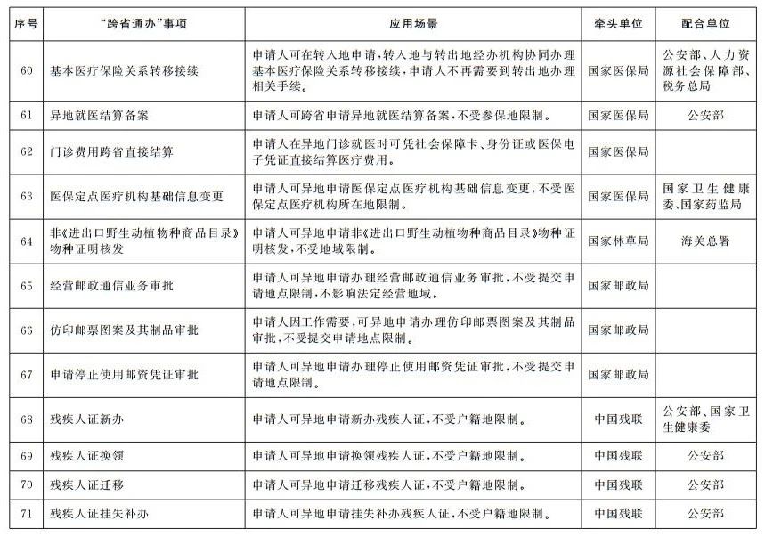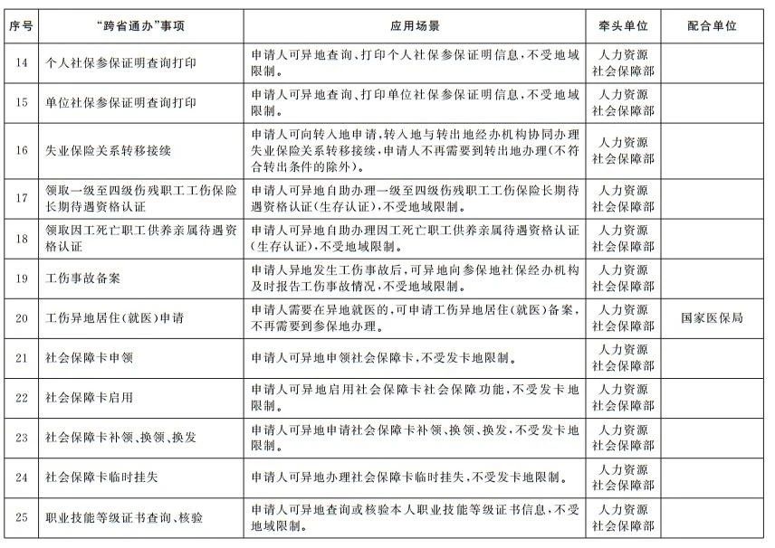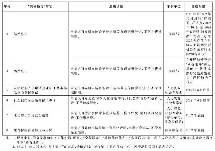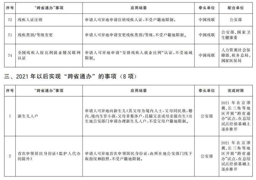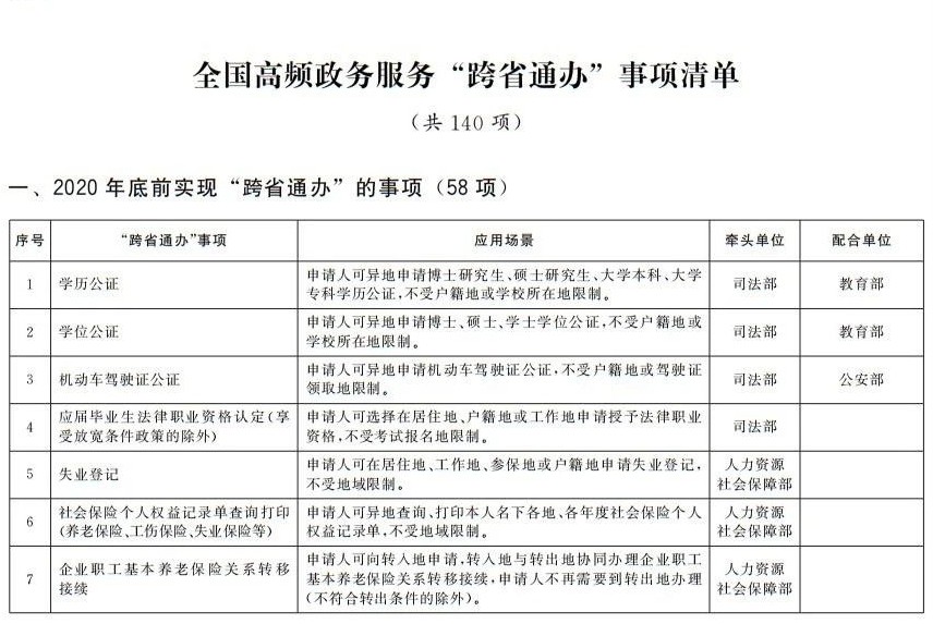 (一)聚焦保障改善民生,推動個人服務(wù)高頻事項(xiàng)“跨省通辦”。圍繞教育、就業(yè)、社保、醫(yī)療、養(yǎng)老、居住、婚育、出行等與群眾生活密切相關(guān)的異地辦事需求,推動社會保障卡申領(lǐng)、異地就醫(yī)登記備案和結(jié)算、養(yǎng)老保險關(guān)系轉(zhuǎn)移接續(xù)、戶口遷移、住房公積金轉(zhuǎn)移接續(xù)、就業(yè)創(chuàng)業(yè)、婚姻登記、生育登記等事項(xiàng)加快實(shí)現(xiàn)“跨省通辦”,便利群眾異地辦事,提升人民群眾獲得感。
