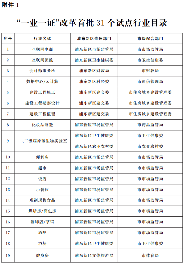 上海市浦東新區(qū)“一業(yè)一證”改革試點(diǎn)實(shí)施方案
