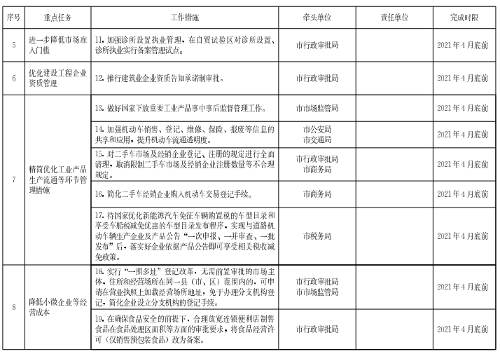 ?。ㄎ澹┻M(jìn)一步降低市場準(zhǔn)入門檻。做好《市場準(zhǔn)入負(fù)面清單(2020年版)》實(shí)施工作,嚴(yán)格落實(shí)“一張清單”管理模式,確?!耙粏伪M列、單外無單”。圍繞工程建設(shè)、教育、醫(yī)療、體育等領(lǐng)域開展集中清理,清除市有關(guān)部門和各市在市場準(zhǔn)入方面對企業(yè)資質(zhì)、資金、股比、人員、場所等設(shè)置的不合理?xiàng)l件,列出臺賬并逐項(xiàng)明確解決措施、責(zé)任主體和完成時限。加強(qiáng)診所設(shè)置執(zhí)業(yè)管理,在自貿(mào)試驗(yàn)區(qū)對診所設(shè)置、診所執(zhí)業(yè)實(shí)行備案管理試點(diǎn),條件成熟后在全市推廣。