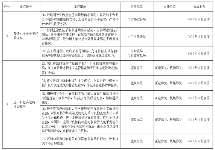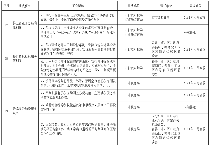 為貫徹落實(shí)《河北省人民政府辦公廳關(guān)于進(jìn)一步優(yōu)化營商環(huán)境更好服務(wù)市場主體若干措施》(冀政辦字〔2020〕170號)精神,結(jié)合統(tǒng)籌常態(tài)化疫情防控和經(jīng)濟(jì)社會發(fā)展要求,更好服務(wù)市場主體,切實(shí)解決企業(yè)生產(chǎn)經(jīng)營中的堵點(diǎn)、痛點(diǎn)、難點(diǎn),加快建設(shè)一流營商環(huán)境體系,制定如下措施。