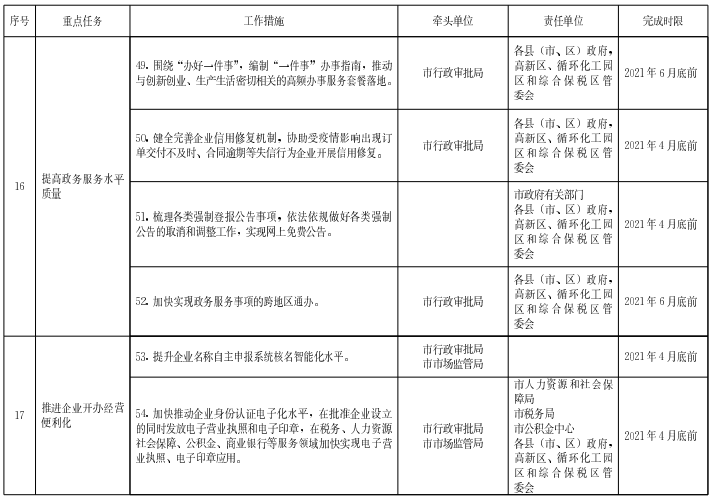 ?。ㄊ┨岣哒?wù)服務(wù)水平質(zhì)量。優(yōu)化完善全市一體化政務(wù)服務(wù)平臺功能,健全完善全市政務(wù)服務(wù)大數(shù)據(jù)庫,依托人工智能、區(qū)塊鏈、大數(shù)據(jù)、移動互聯(lián)網(wǎng)等現(xiàn)代信息技術(shù),推進(jìn)跨地區(qū)、跨部門、跨層級數(shù)據(jù)共享與融合,推動更多事項(xiàng)全流程網(wǎng)上辦理。圍繞“辦好一件事”,編制“一件事”辦事指南,推動與創(chuàng)新創(chuàng)業(yè)、生產(chǎn)生活密切相關(guān)的高頻辦事服務(wù)套餐落地。健全完善企業(yè)信用修復(fù)機(jī)制,協(xié)助受疫情影響出現(xiàn)訂單交付不及時、合同逾期等失信行為企業(yè)開展信用修復(fù)。梳理各類強(qiáng)制登報公告事項(xiàng),依法依規(guī)做好各類強(qiáng)制公告的取消和調(diào)整工作,實(shí)現(xiàn)網(wǎng)上免費(fèi)公告。加快實(shí)現(xiàn)政務(wù)服務(wù)事項(xiàng)的跨地區(qū)通辦。