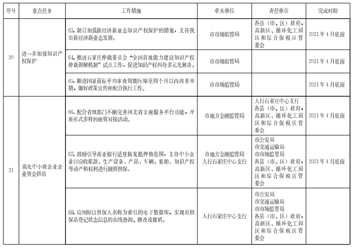 ?。ǘ唬?qiáng)化中小微企業(yè)資金供給。配合省部門不斷完善石家莊市金融服務(wù)平臺功能,開展形式多樣的融資對接活動。鼓勵引導(dǎo)商業(yè)銀行適度拓寬抵押物范圍,支持中小企業(yè)以應(yīng)收賬款、生產(chǎn)設(shè)備、產(chǎn)品、車輛、船舶、知識產(chǎn)權(quán)等動產(chǎn)和權(quán)利進(jìn)行融資擔(dān)保。應(yīng)用好以擔(dān)保人名稱為索引的電子數(shù)據(jù)庫,實(shí)現(xiàn)對擔(dān)保品登記狀態(tài)信息的在線查詢、修改或撤銷。推動規(guī)范和減免企業(yè)融資中的不合理收費(fèi),精簡審批程序,提高信貸規(guī)模和比重。
