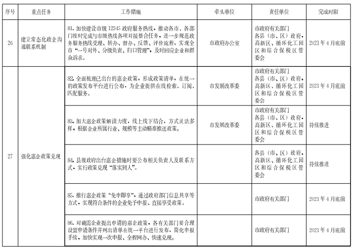 ?。ǘ撸?qiáng)化惠企政策兌現(xiàn)。全面梳理已出臺的惠企政策,形成政策清單,在統(tǒng)一的政策發(fā)布平臺進(jìn)行公布,為企業(yè)提供在線檢索、訂閱、匹配服務(wù)。加大惠企政策解讀力度,線上線下結(jié)合,方式靈活多樣,根據(jù)企業(yè)所屬行業(yè)、規(guī)模等主動精準(zhǔn)推送政策??h級政府出臺惠企措施時要公布相關(guān)負(fù)責(zé)人及聯(lián)系方式,實(shí)行政策兌現(xiàn)“落實(shí)到人”。推行惠企政策“免申即享”,通過政府部門信息共享等方式,實(shí)現(xiàn)符合條件的企業(yè)免予申報、直接享受政策。對確需企業(yè)提出申請的惠企政策,各有關(guān)部門要合理設(shè)置申請條件并列出清單在統(tǒng)一平臺進(jìn)行發(fā)布,簡化申報手續(xù),加快實(shí)現(xiàn)一次申報、全程網(wǎng)辦、快速兌現(xiàn)。