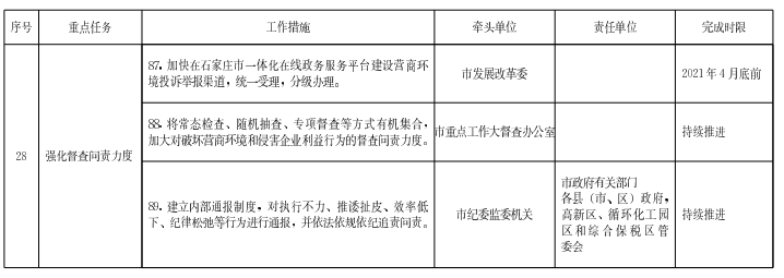 (二十八)強(qiáng)化督查問責(zé)力度。加快在石家莊市一體化在線政務(wù)服務(wù)平臺建設(shè)營商環(huán)境投訴舉報渠道,統(tǒng)一受理,分級辦理。將常態(tài)檢查、隨機(jī)抽查、專項(xiàng)督查等方式有機(jī)集合,加大對破壞營商環(huán)境和侵害企業(yè)利益行為的督查問責(zé)力度。建立內(nèi)部通報制度,對執(zhí)行不力、推諉扯皮、效率低下、紀(jì)律松弛等行為進(jìn)行通報,并依法依規(guī)依紀(jì)追責(zé)問責(zé)。
