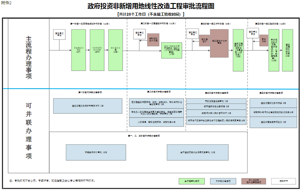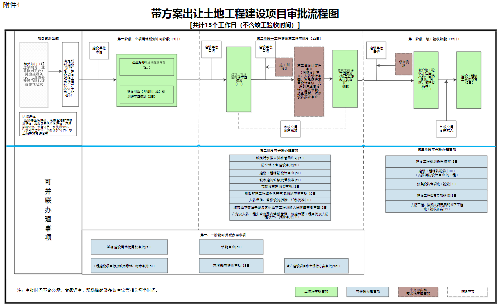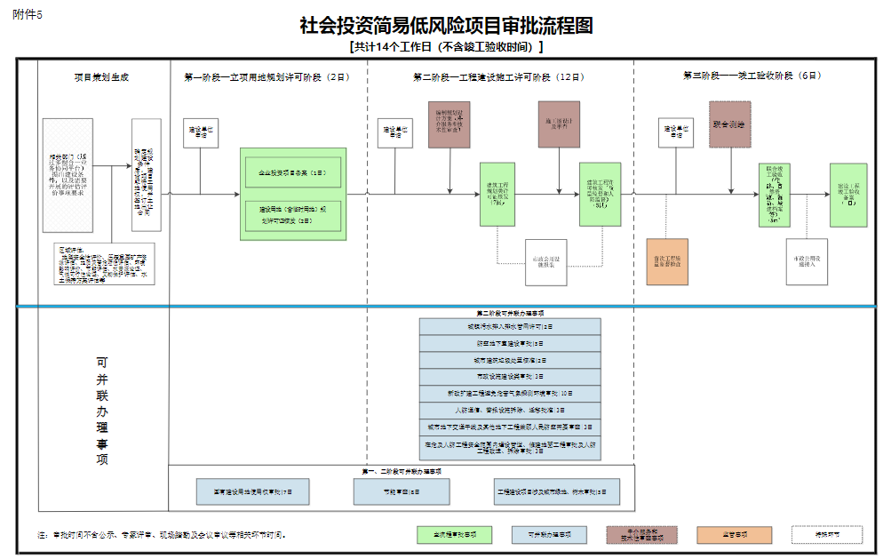 5.合并審批階段。將帶方案出讓土地工程建設(shè)項(xiàng)目、社會(huì)投資簡(jiǎn)易低風(fēng)險(xiǎn)項(xiàng)目審批階段調(diào)整為立項(xiàng)用地規(guī)劃許可、工程建設(shè)施工許可和竣工驗(yàn)收等3個(gè)階段。(責(zé)任單位:省政府有關(guān)部門,各市、縣政府,雄安新區(qū)管委會(huì))