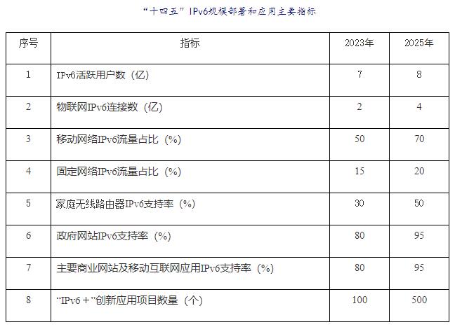 到2023年末,基本建成先進(jìn)自主的IPv6技術(shù)、產(chǎn)業(yè)、設(shè)施、應(yīng)用和安全體系,形成市場(chǎng)驅(qū)動(dòng)、協(xié)同互促的良性發(fā)展格局。IPv6活躍用戶數(shù)達(dá)到7億,物聯(lián)網(wǎng)IPv6連接數(shù)達(dá)到2億。移動(dòng)網(wǎng)絡(luò)IPv6流量占比達(dá)到50%,城域網(wǎng)IPv6流量占比達(dá)到15%。國內(nèi)主要內(nèi)容分發(fā)網(wǎng)絡(luò)、數(shù)據(jù)中心、云服務(wù)平臺(tái)、域名解析系統(tǒng)基本完成IPv6改造。新上市的家庭無線路由器全面支持并默認(rèn)開啟IPv6功能??h級(jí)以上政府網(wǎng)站、國內(nèi)主要商業(yè)網(wǎng)站及移動(dòng)互聯(lián)網(wǎng)應(yīng)用IPv6支持率顯著提升。IPv6單棧試點(diǎn)取得積極進(jìn)展,新增網(wǎng)絡(luò)地址不再使用私有IPv4地址。