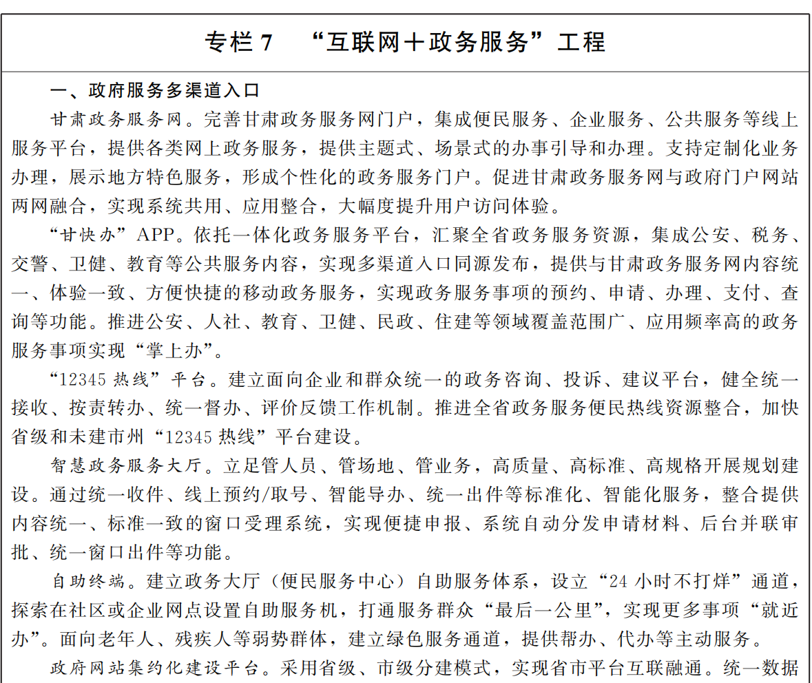 推動(dòng)政務(wù)服務(wù)規(guī)范化。統(tǒng)籌歸并網(wǎng)上辦事入口,推動(dòng)多渠道無差別服務(wù),持續(xù)優(yōu)化甘肅政務(wù)服務(wù)網(wǎng)、“甘快辦”APP、“12345熱線”,實(shí)現(xiàn)網(wǎng)上辦事“一次注冊(cè)、多點(diǎn)互認(rèn)、全網(wǎng)通行”。規(guī)范網(wǎng)上辦事指引,提供更加簡(jiǎn)便易懂的辦事指南和線上辦事操作說明,創(chuàng)新在線導(dǎo)辦、智能推薦等手段,實(shí)現(xiàn)“一端在手、一看就懂、一點(diǎn)就能辦”。深化各級(jí)政府網(wǎng)站、政務(wù)服務(wù)平臺(tái)適老化、無障礙改造。建設(shè)全科無差別受理智慧政務(wù)服務(wù)大廳,統(tǒng)籌推進(jìn)線上線下服務(wù)融合互通,提升政務(wù)服務(wù)便捷性。